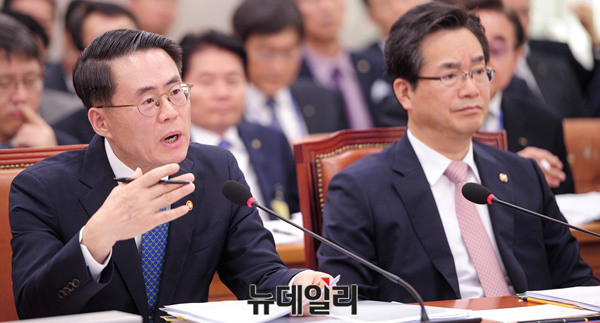 김재수 농림축산식품부 장관이 13일 오전 국회에서 열린 국회 농림축산식품해양수산위원회 농림축산식품부 및 소관기관 등에 대한 종합감사에 출석해 질의에 답하고 있다.