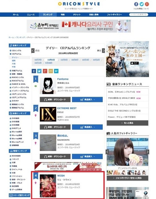 한류스타 류시원이 지난 5일 유니버셜 뮤직을 통해 발매한 ‘WISH’가 일본 오리콘 일간차트 4위에 오르는 저력을 과시했다.