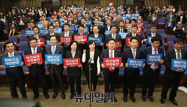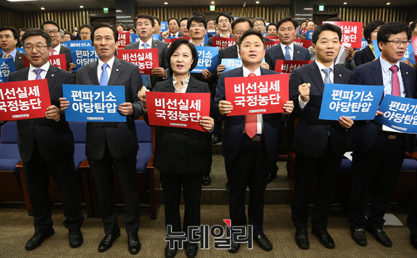 더불어민주당 추미애 대표, 우상호 원내대표 등 소속 의원들이 13일 오후 국회에서 의원총회를 열고 '편파기소 야당탄압 비선실세 국정농단' 피켓을 들고 구호를 외치고 있다.