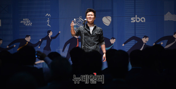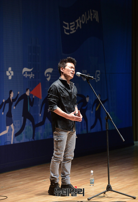 가수 안치환이 17일 오후 서울시청 다목적홀에서 열린 '근로자이사제 기념식'에서 축하 공연을 하고 있다.