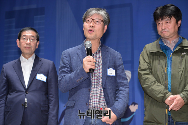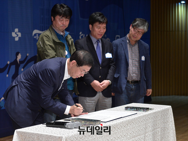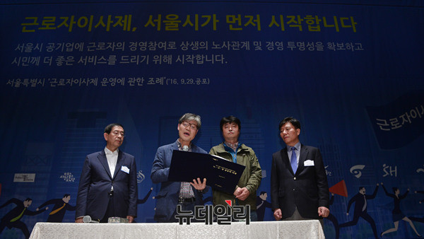 박원순 서울시장, 김태호 사용자협의회장, 명순필 노동조합협의회장, 박태주 노사정서울모델협의회위원장(왼쪽부터)이 17일 오후 서울시청 다목적홀에서 열린 '근로자이사제 기념식'에서 노사정 공동의다짐 서약서를 들고 포즈를 취하고 있다.