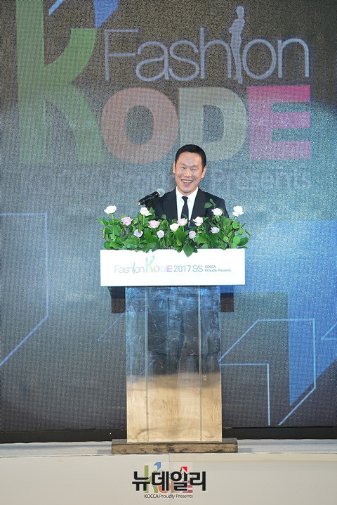 송지오 한국디자이너연합회장이 18일 오전 남산 제이그랜하우스에서 진행된 '패션코드(Fashion KODE) 2017 S/S' 오프닝 기념식에서 환영사를 하고 있다.
