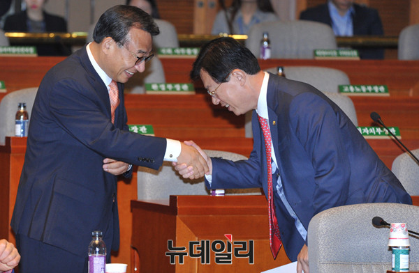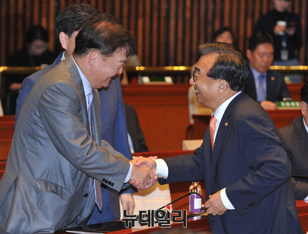 새누리당 이정현 대표가 18일 오전 국회에서 열린 '송민순 회고록' 관련 긴급 의원총회에 참석해 동료의원들과 인사를 나누고 있다.