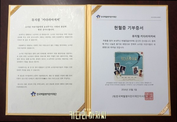 힐링 뮤지컬 '키다리 아저씨'가 마지막까지 따뜻함을 잃지 않았다.지난 3일 막을 내린 뮤지컬 '키다리 아저씨'는 약 2개월 동안 할인 이벤트를 통해 관객들에게 기부 받은 헌혈증 930매를 한국 백혈병 어린이 재단에 전달했다.제작사 달 컴퍼니는 "극중 고아원에서 자란 '제루샤 애봇'을 당당한 현대여성으로 성장할 수 있게끔 도와줬던 키다리 아저씨 '제르비스 펜들턴'처럼 관객들이 기부한 헌혈증이 소아암 어린이들에게도 희망과 꿈을 줄 수 있었으면 좋겠다"고 밝혔다.진 웹스터의 명작소설을 섬세한 연출과 서정적인 멜로디로 풀어낸 뮤지컬 '키다리 아저씨'는 원작이 지닌 친숙함과 혼성 2인극이라는 흔치 않은 구성을 지닌 작품으로 관객들에게 클래식한 감동을 선사했다.무엇보다 7월 19일 개막 이후 완성도 높은 작품성과 아날로그 감성, 유쾌한 에너지로 관객과 평단의 호평을 받았다. 국내 초연임에도 높은 평점과 꾸준한 지지를 받으며 연이은 전석 매진으로 작품성과 흥행성을 모두 입증하기도 했다.뮤지컬 '키다리 아저씨'가 기부한 헌혈증 930매는 소아암·백혈병 환자들의 치료에 쓰일 예정이다.[사진=달 컴퍼니]