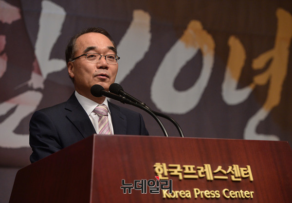 박재완 한반도선진화재단 이사장이 19일 한국프레스센터 국제회의장에서 열린 '한선창립10주년기념식'에서 개회사를 하고 있다.