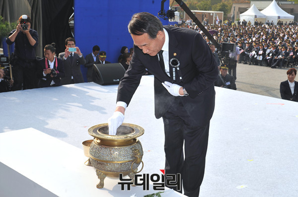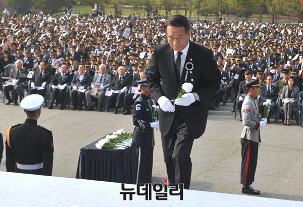 박승춘 국가보훈처장 19일 오후 서울 동작구 국립서울현충원 현충선양광장에서 열린 '장진호 전투영웅 추도식'에서 헌화를 하고 있다.