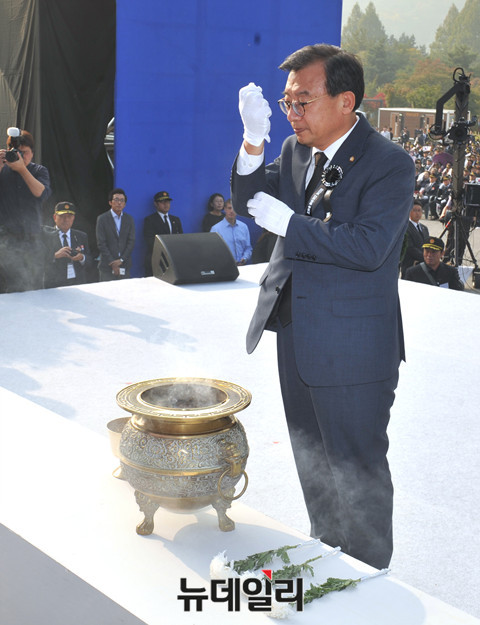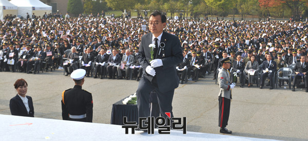 이정현 새누리당 대표가 19일 오후 서울 동작구 국립서울현충원 현충선양광장에서 열린 '장진호 전투영웅 추도식'에서 헌화를 하고 있다.
