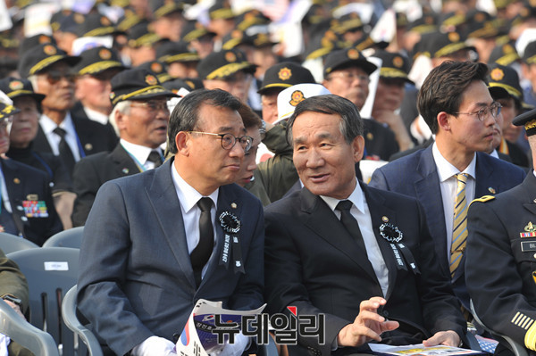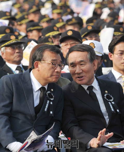 이정현 새누리당 대표가 19일 오후 서울 동작구 국립서울현충원 현충선양광장에서 열린 '장진호 전투영웅 추도식'에 참석해 박승춘 보훈처장과 대화를 나누고 있다.