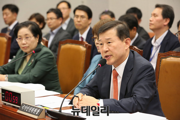 이성호 인권위원장이 20일 오전 국회 운영위원회실에서 열린 국가인권위원회에 대한 국정감사에서 의원들의 질문에 답하고 있다.