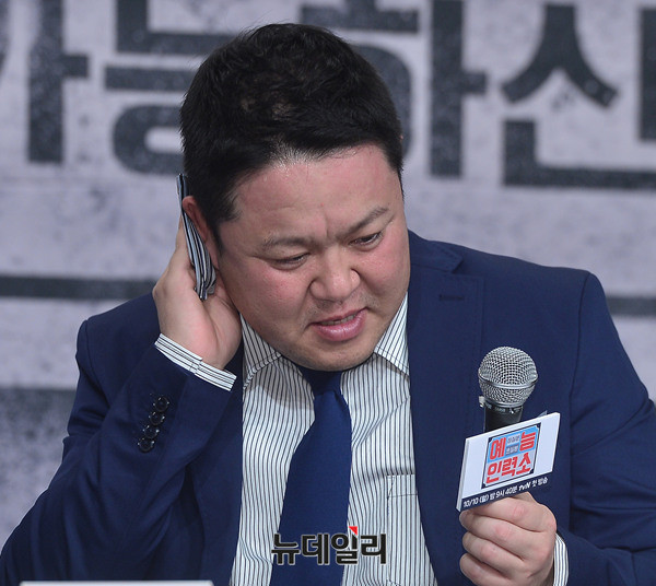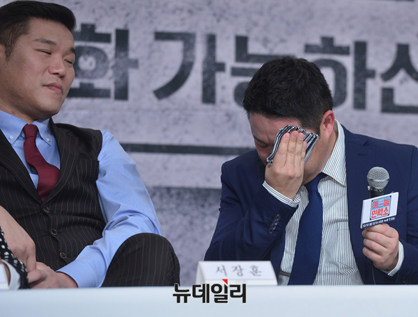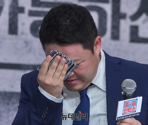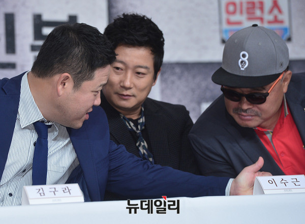 김구라가 21일 오전 영등포타임스퀘어에서 열린 tvN 새 예능프로그램 '예능인력소' 제작보고회에서 김흥국의 계속된 칭찬에 무안해하며 땀을 닦고 있다.