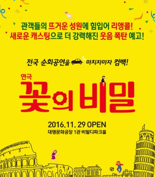 '꽃의 비밀'은 장진 감독이 2002년 연극 '웰컴 투 동막골' 이후 13년 만에 선보인 코미디로, 지난해 창작 초연임에도 객석점유율 90%를 기록하며 흥행에 성공했다.