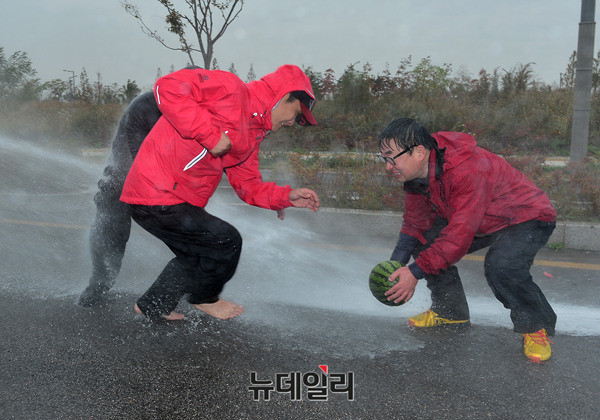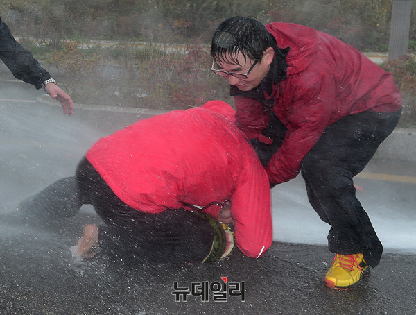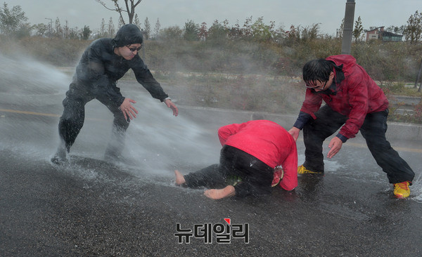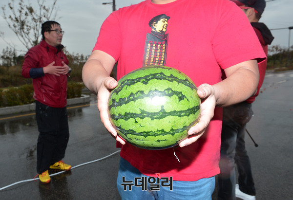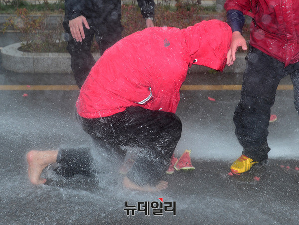 신혜식 독립신문 대표, 장기정 자유청년연합 대표, 최대집 자유개척청년단 상임대표가 23일 오후 인천 중구의 한 도로에서 고(故) 백남기 씨의 사인을 밝히기 위해 수박을 이용해 물대포 실험에 참가하고 있다.