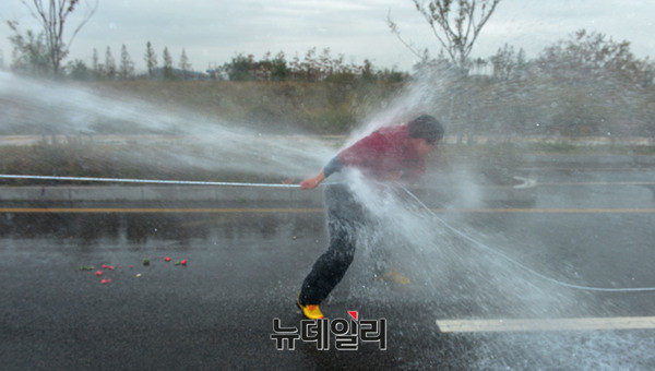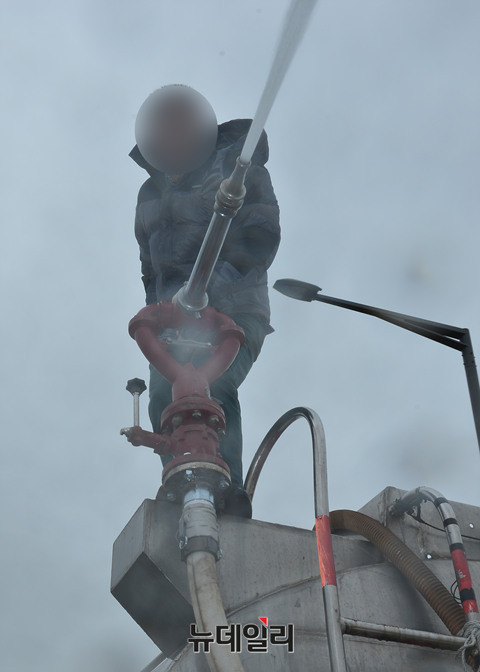 이날 실험에는 살수차를 이용해 0.6~1.3MPa 압력으로 5~15m 떨어진 거리에서 살수 했다. (인천=뉴데일리 정상윤 기자)