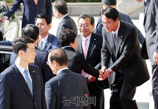 [포토] 새누리당 지도부 배웅 받는 박근혜 대통령