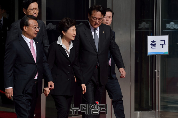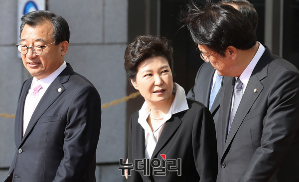 박근혜 대통령이 24일 오전 국회 본회의장에서 2017년도 예산안 시정연설을 끝내고 새누리당 이정현 대표, 정진석 원내대표의 배웅을 받고 있다.