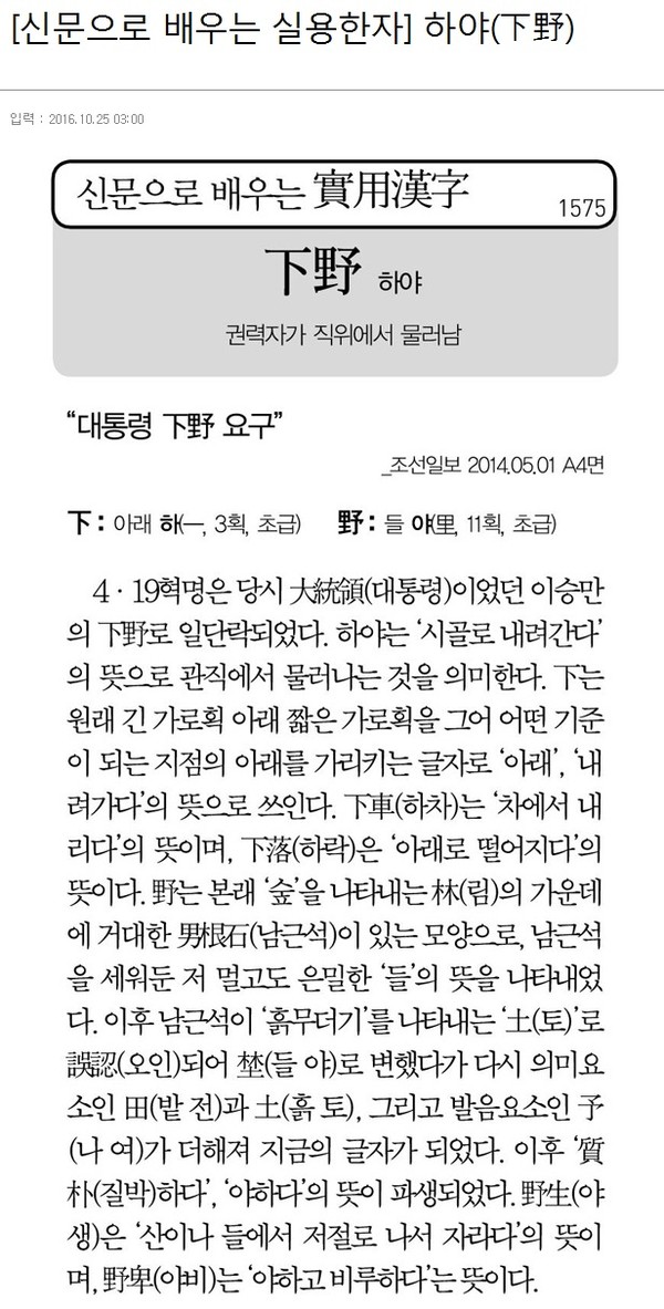 조선일보는 25일자 B섹션 11면 '신문으로 배우는 실용한자' 코너에서, 2014년 5월 1일자 조선일보 4면에 실렸던 '일부 진보단체·네티즌, 대통령 下野 요구·욕설까지'라는 제하의 기사를 거론한 뒤 "여기에 등장하는 '하야'는 시골로 내려간다는 뜻으로 관직에서 물러나는 것을 의미한다"는 친절한(?) 설명을 덧붙였다.