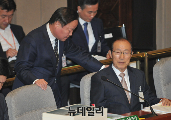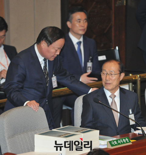이원종 청와대 비서실장과 김재원 정무수석이 26일 오전 국회에서 열린 예산결산특별위원회 전체회의에 참석해 대화를 나누고 있다.