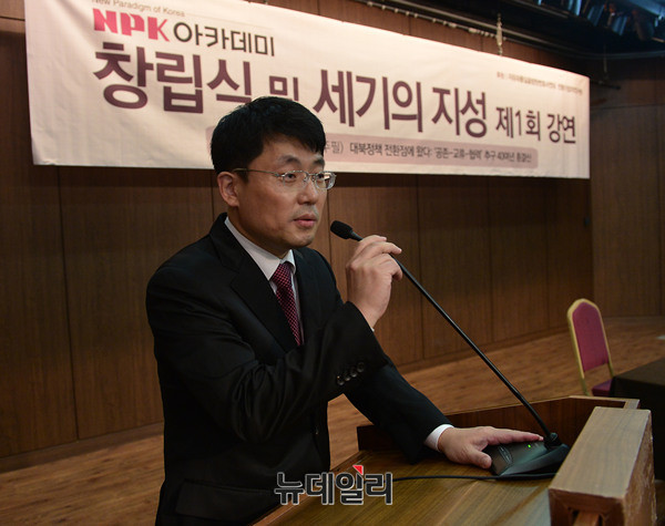 도태우 NPK(New Paradigm of Korea, 한반도뉴패러다임)아카데미 대표가 26일 오후 서울 중구 은행회관 국제회의장에서 열린 'NPK아카데미 창립식'에서 인사말을 하고 있다. 이날 세기의지성 제1회 강연은 류근일 전 조선일보 주필이 맡았다.