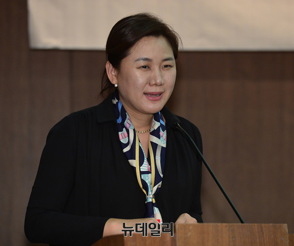 김미영 전환기정의연구원장이 26일 오후 서울 중구 은행회관 국제회의장에서 열린 'NPK(New Paradigm of Korea, 한반도뉴패러다임)아카데미 창립식'에서 인사말을 하고 있다. 이어 열린 시기의지성 강연은 류근일 전 조선일보 주필이 '대북정책전환점에왔다: '공존-교류-협력' 추구40여년총결산'을 주제로 발표를 맡았다.