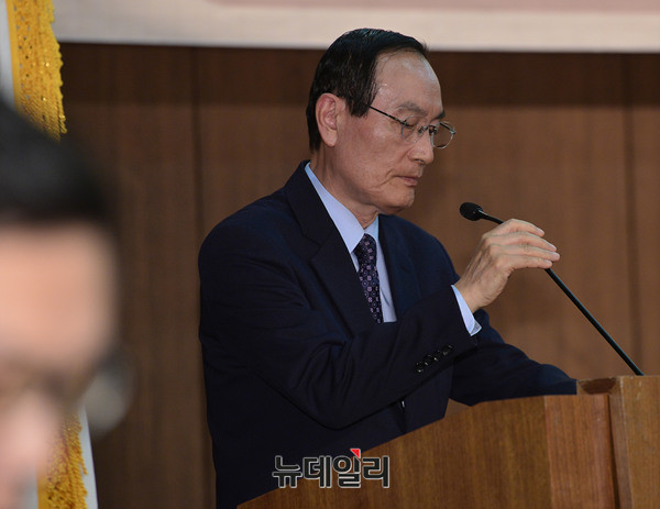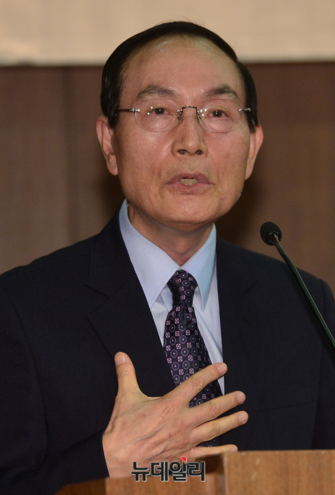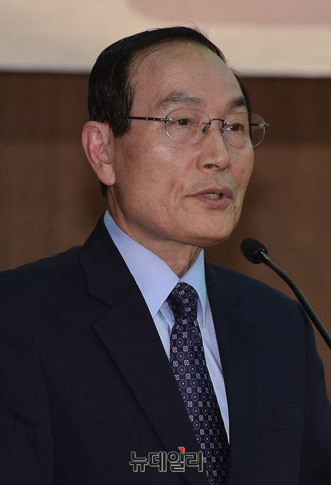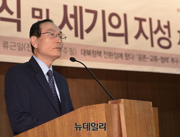 한상완 전 연세대학교 부총장이 26일 오후 서울 중구 은행회관 국제회의장에서 열린 'NPK(New Paradigm of Korea, 한반도뉴패러다임)아카데미 창립식'에서 축사를 하고 있다. 이어 열린 시기의지성 강연은 류근일 전 조선일보 주필이 '대북정책전환점에왔다: '공존-교류-협력' 추구40여년총결산'을 주제로 발표를 맡았다.
