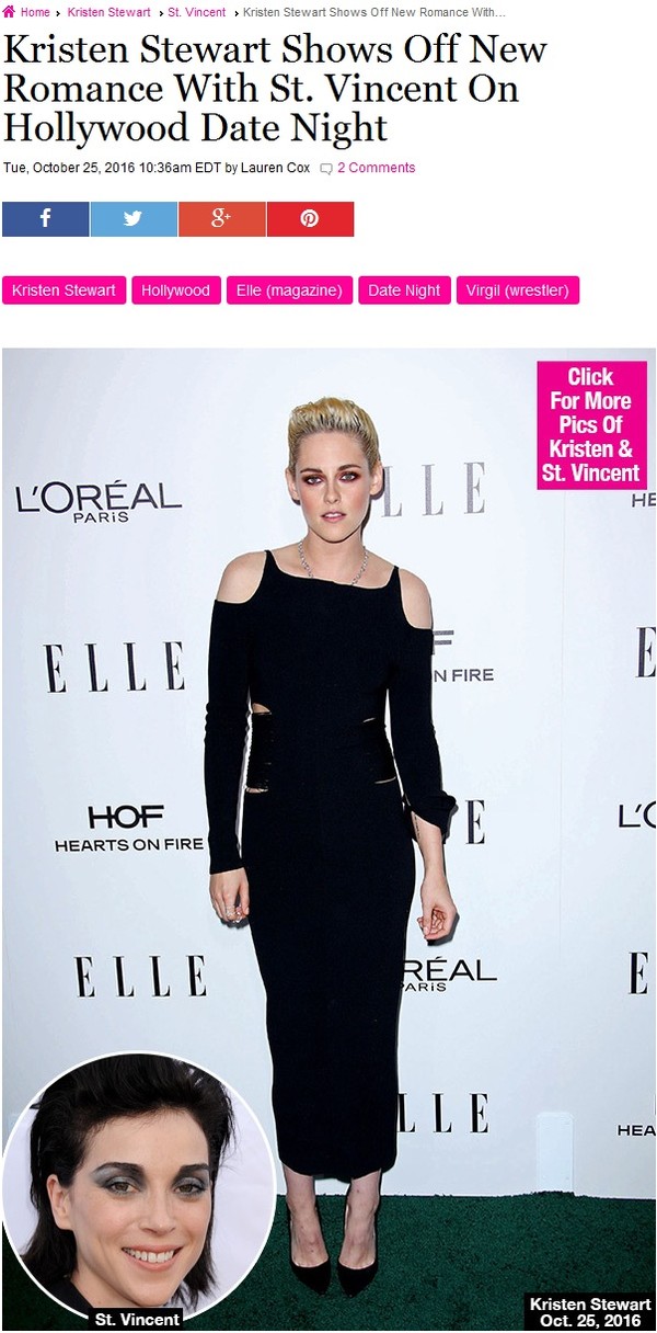 크리스틴 스튜어트는 현지시각으로 지난 25일 미국 캘리포니아 주 로스앤젤레스에서 열린 '제 23회 엘르 위민 인 할리우드 어워드(ELLE Women in Hoppywood Awards)'에 새 연인인 세인트 빈센트와 동반 참석한 것으로 알려졌다.