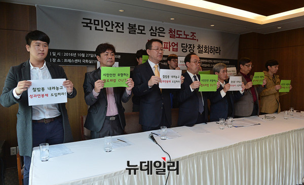 바른사회시민회의가 27일 오전 한국프레스센터에서 '국민안전 볼모 삼은 철도노조 장기파업 규탄' 기자회견을 열고 ▲기득권 투쟁에 나선 철도노조 파업철회 촉구 ▲불법파업에 대한 엄정한 징계와 파업손실에 대한 손해배상청구와 성과연봉제도입을 요구했다.