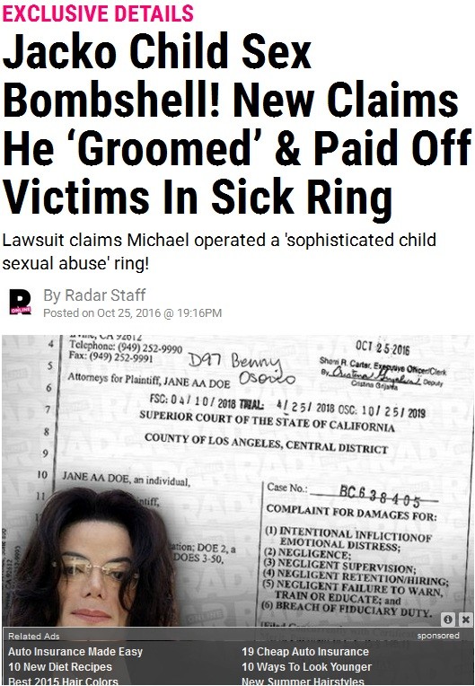미국의 연예매체 레이더온라인닷컴(Raderonline.com)은 현지 시각으로 25일 "팝스타 마이클 잭슨은 생전, 자신의 '성적인 노리개'로 삼기 위해 아동을 조달하는 조직을 비밀리에 운영해왔는데, 어린 시절 이 기관을 통해 마이클 잭슨에게 피해를 입은 한 여성이 거액의 손해배상을 요구하는 법적 소송을 제기했다"고 밝혔다.