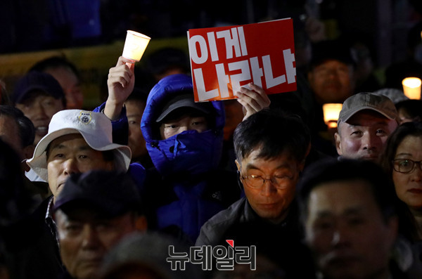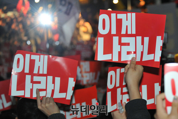 '모이자! 분노하자! 내려와라 박근혜' 촛불집회가 29일 오후 서울 종로구 청계광장에서 열린 가운데 시민들이 '이게 나라냐' 라는 피켓을 들고 박근혜 대통령을 규탄하고 있다.