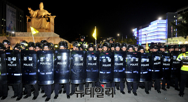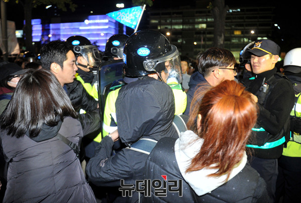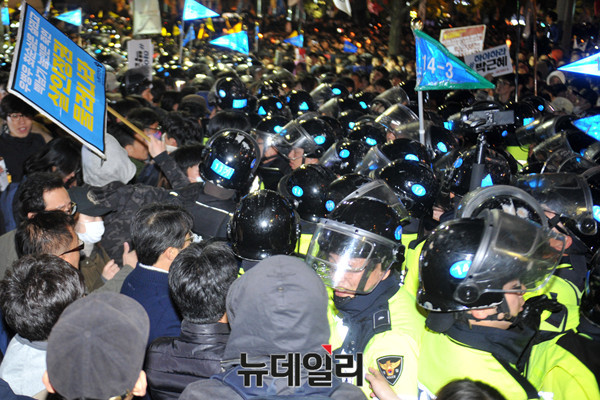 '모이자! 분노하자! 내려와라 박근혜' 촛불집회가 29일 오후 서울 종로구 청계광장에서 열린 가운데 시위 참가자들이 경찰과 충돌하고 있다.
