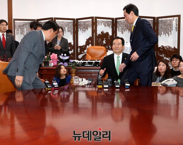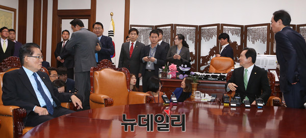 새누리당 정진석 원내대표가 31일 오전 국회의장실에서 열린 여야 3당 원내대표 회동에서 야당의 거국내각 거부 문제에 대해 항의하며 국회의장실을 떠나고 있다.