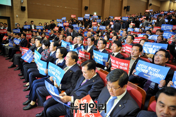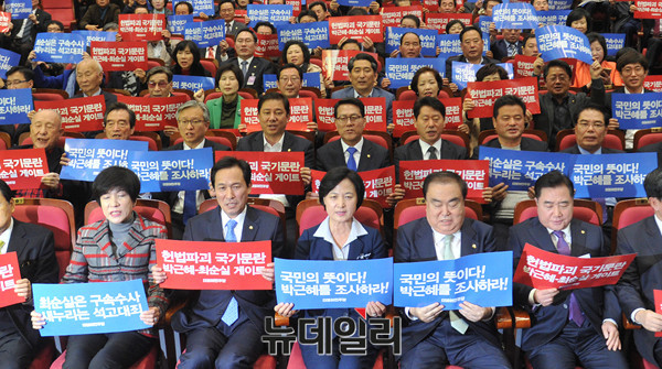 더불어민주당 추미애 대표 등 소속의원이 1일 오전 국회의원회관 대강당에서 열린 '박근혜-최순실 게이트 진상규명 국민보고대회'에서 구호를 외치고 있다.