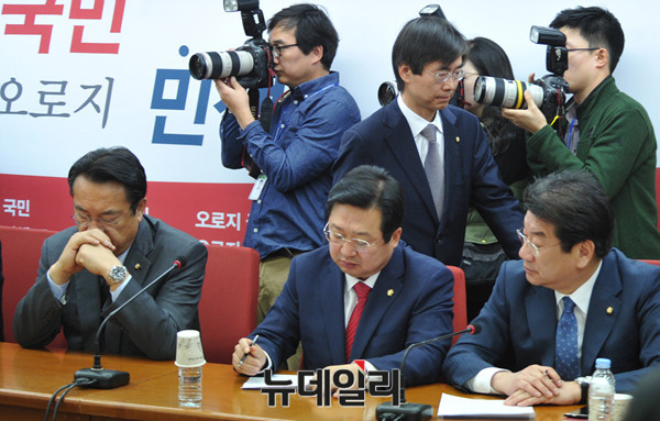 새누리당 조경태 의원이 2일 오전 서울 여의도 새누리당사에서 열린 최고위원 중진의원 연석 간담회 중 이정현 대표와 정병국 의원이 충돌하자 굳은 얼굴로 자리를 떠나고 있다.
