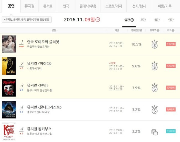 배우 문근영과 박정민 등 초호화 캐스팅으로 화제를 모은 연극 '로미오와 줄리엣'이 막강한 티켓 파워를 과시했다.지난 3일 오후 2시 1차 티켓을 오픈한 '로미오와 줄리엣'은 쟁쟁한 연말 대작들을 누르고 전체 예매순위 1위를 기록했다. 특히, 연극 부문에서는 점유율이 53.7%에 달하며 남다른 인기를 실감케 했다.'로미오와 줄리엣'은 올해 서거 400주년을 맞은 윌리엄 셰익스피어의 최대 걸작으로, 시대와 국적을 불문하고 오페라, 발레, 연극, 뮤지컬, 영화, 드라마 등 수많은 장르로 변용돼왔다.이번 공연에는 박정민(로미오 役), 문근영(줄리엣 役), 손병호(로렌스 신부 役), 서이숙-배해선(유모 役), 김호영-이현균((머큐쇼 役), 양승리(티볼트 役), 김찬호(패리스 役), 김성철(벤볼리오 役) 등 10인이 출연한다.세기를 뛰어넘은 희비극 '로미오와 줄리엣'은 12월 9일부터 2017년 1월 15일까지 국립극장 달오름극장에서 공연된다.
