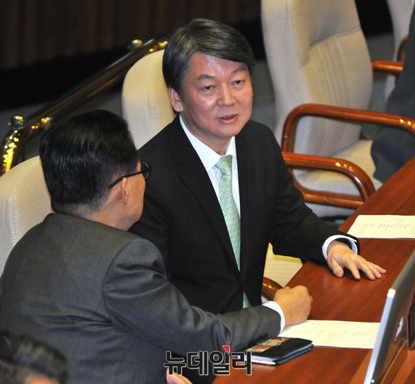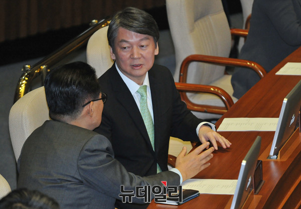 국민의당 안철수 전 공동대표가 3일 오후 국회에서 열린 본회의에서 박지원 비상대책위원장과 대화를 나누고 있다.