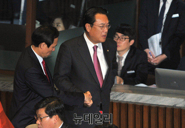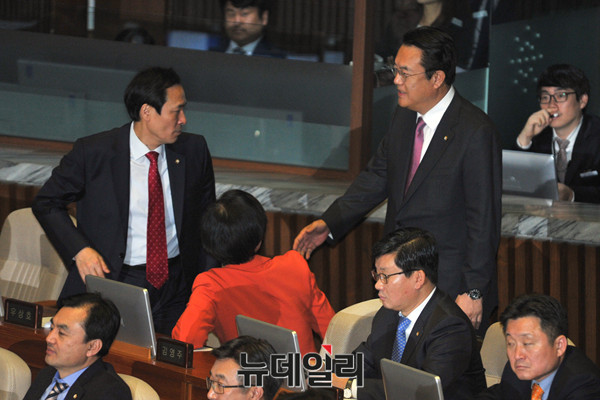 새누리당 정진석 원내대표가 3일 오후 국회에서 열린 본회의에서 더불어민주당 우상호 원내대표와 대화를 나누고 있다.