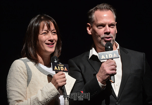 뮤지컬 아이다에서 해외협력 연출을 맡은 '키이스 배튼(Keith Batten)'과 국내협력 연출을 맡은 박칼린이 4일 오후 서울 송파구 샤롯데씨어터에서 열린 뮤지컬 '아이다(AIDA)' 프레스콜에서 아이다를 소개하고 있다. 배우 윤공주, 장은아, 김우형, 민우혁, 아이비, 이정화, 성기윤, 박성환, 김덕환, 김선동, 강은일 등이 출연한다.