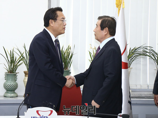 신임 한광옥 대통령 비서실장이 4일 오후 국회 새누리당 정진석 원내대표를 찾아 인사를 나누고 있다.
