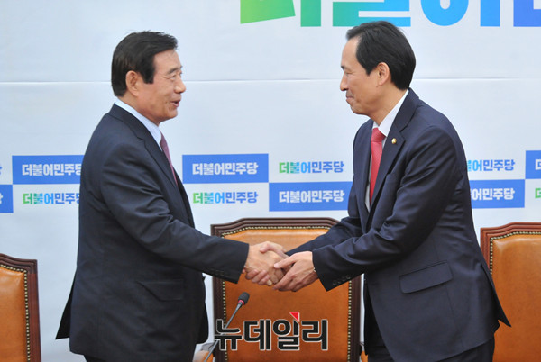 한광옥 신임 대통령 비서실장이 4일 오후 국회 더불어민주당 우상호 원내대표를 찾아 인사를 나누고 있다.