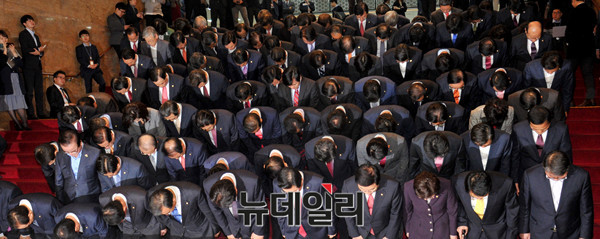 새누리당 이정현 대표를 포함한 소속의원들이 4일 오후 국회에서 의원총회에 앞서 '최순실 비리의혹 관련' 사과를 하고 있다.