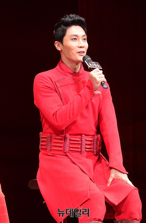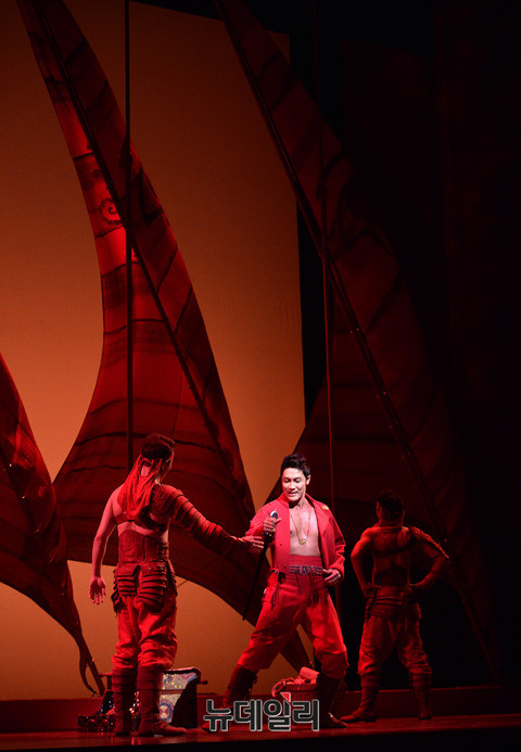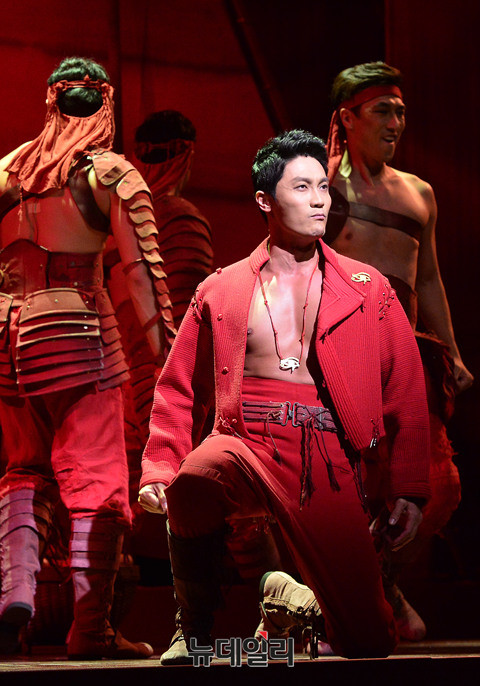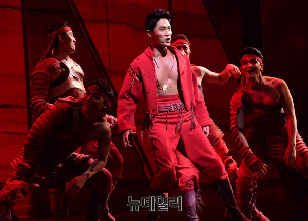 뮤지컬 아이다에서 라다메스 역을 맡은 배우 김우형이 4일 오후 서울 송파구 샤롯데씨어터에서 열린 '아이다(AIDA)' 프레스콜에서 하이라이트 장면을 시연하고 있다. 김우형은 "'라다메스'가 가진 두려움 없는 뜨거움을 노련함과 성숙함으로 잘 만들어보겠다"고 각오를 밝혔다.