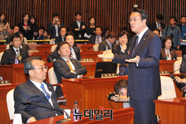 새누리당 정진석 원내대표가 4일 오후 국회에서 열린 새누리당 의원총회에서 비박계 의원들이 공개 의총을 요구하자 "내 권한이다! 공개하려면 나를 탄핵하라!" 라며 고성을 지르고 있다.