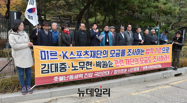 촛불난동세력진압국민연대를 비롯한 애국단체가 4일 오후 서울 중앙지검 앞에서 기자회견을 열고 "미르, K스포츠재단의 모금을 심판하는 기준으로 좌익재단들의 모금도 심판하라"고 주장했다.