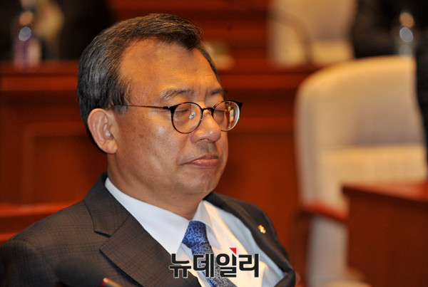 이정현 새누리당 대표가 4일 오후 서울 여의도 국회에서 열린 새누리당 의원총회에서 의총의 공개 여부를 놓고 친박과 비박이 충돌하자 눈을 감고 생각에 잠겨있다.
