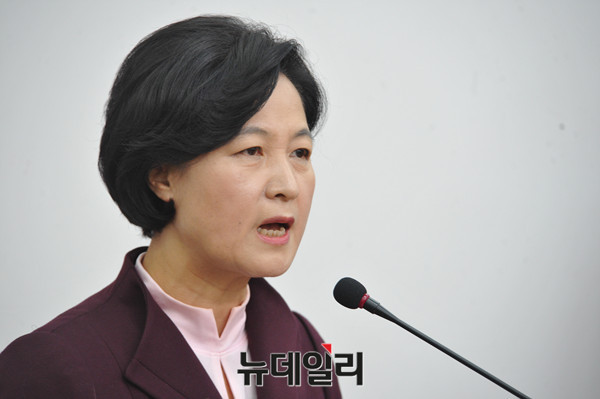 추미애 더불어민주당 대표가 4일 오전 국회 당대표실에서 박근혜 대통령 대국민담화문과 관련해 기자회견을 갖고 있다.