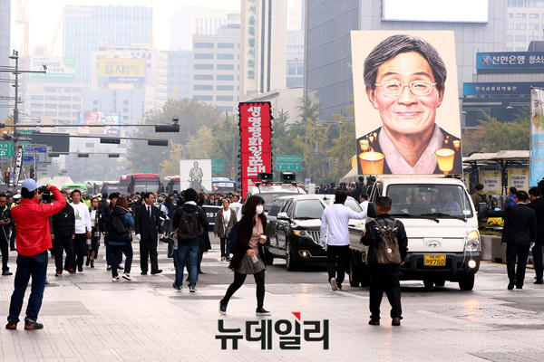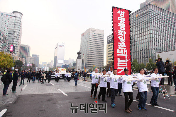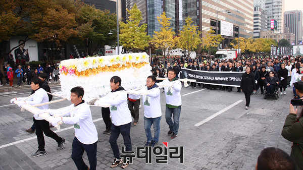 고(故) 백남기씨의 운구행렬이 5일 서울 종로1가에서 노제를 마친 후 영결식이 열리는 광화문 광장으로 이동하고 있다.