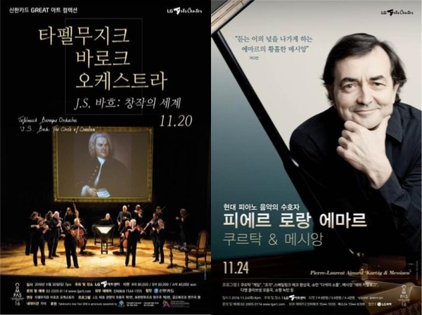 LG아트센터가 바흐(1685-1750)부터 쿠르탁(1926-)까지 240년을 가로지는 극과 극의 클래식 공연을 선보인다.먼저 11월 20일, 북미를 대표하는 시대악기 연주단체 타펠무지크 바로크 오케스트라와 함께 '음악의 아버지' 바흐가 살았던 18세기 라이프치히로 감성여행을 떠난다.공연은 'J.S. 바흐: 창작의 세계'라는 부제처럼 바흐의 음악적 고향이자 18세기 유럽의 공예와 교역의 중심 도시였던 라이프치히를 중심으로 서양음악에서 가장 위대한 유산을 남긴 바흐의 음악 이야기를 만날 수 있다.'타펠무지크 바로크 오케스트라'는 테크놀로지를 결합한 멀티미디어에 흥미로운 스토리텔링까지 3박자를 두루 갖춘 독특한 형태의 콘서트로 유명하다. 이번 공연 역시 관객들로 하여금 바로크 시대 음악을 더욱 재미있고 유익하게 감상할 수 있도록 안내한다.이들은 무대 뿐 아니라 객석을 오가며 바흐의 관현악 모음곡, 브란덴부르크 협주곡 등을 연주한다. 동시에 바흐의 음악과 관련된 당시 시대상을 고화질 비주얼 이미지로 보면서 내레이션을 듣게 되는데, 이날 내레이션은 팝페라가수 카이 맡는다.11월 24일에는 바로크 음악과는 정반대의 매력을 가진 '현대 피아노 음악의 대가' 피에르 로랑 에마르와의 만남이 기다리고 있다.두 번째로 내한하는 피에르 로랑 에마르는 불레즈, 리게티, 슈톡하우젠, 메시앙 등 20~21세기 거장 작곡가들의 절대적인 신뢰를 받으며 '현대 피아노 음악의 교과서'로 불린다.에마르는 16세에 세계적인 작곡가 올리비에 메시앙의 애제자가 됐으며, 올해 타계한 음악계 거물 피에르 불레즈가 1976년에 창단한 현대음악 전문단체 '앙상블 앵테르콩탱포랭'의 창단 멤버이자 피아노 솔리스트였다. 18년간 불레즈와 함께 활동하며 일찌감치 음악계에 자신의 진보적인 존재감을 뚜렷이 각인시켰다.이번 내한의 프로그램은 좌르지 쿠르탁, 올리비에 메시앙 등 에마르의 피아니즘을 가장 잘 보여줄 수 있는 현대음악 레퍼토리 위주로 꾸며질 예정이다. 특히, 에마르가 연주하는 메시앙의 1950년대 역장인 '새의 카탈로그'는 절대 놓칠 수 없는 하이라이트이다.[사진=LG아트센터]