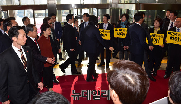 박근혜 대통령이 정세균 국회의장과 총리지명을 상의하기 위해 8일 오전 국회 본청에 들어서던 중 야당 의원들의 퇴진 요구를 받고 있다.