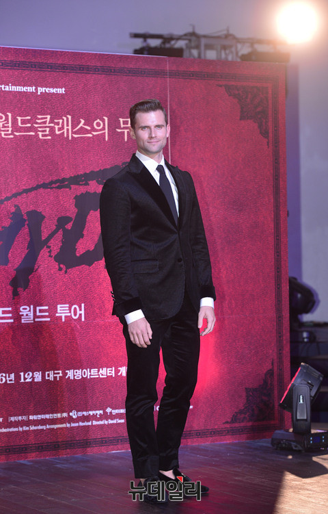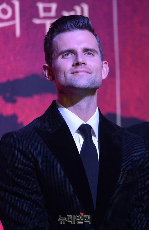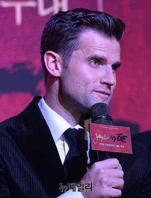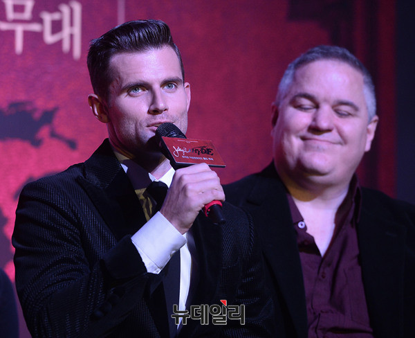 뮤지컬 '지킬앤하이드'에서 지킬, 하이드 역을 맡은 배우 '카일 딘 매시(Kyle Dean Massey)'가 8일 오후 서울 강남구 드레스가든 블리스돔에서 열린 기자간담회에서 인사말을 하고 있다.