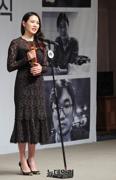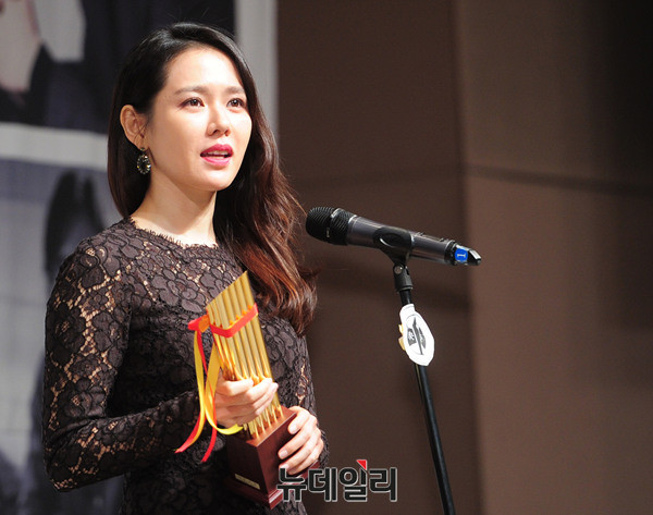 배우 손예진이 8일 오후 한국 프레스센터에서 열린 '제36회 영평상 시상식'에 참석해 여자연기상 수상소감을 밝히고 있다. 손예진은 배우 이병헌과 함께 연기상을 수상했다.