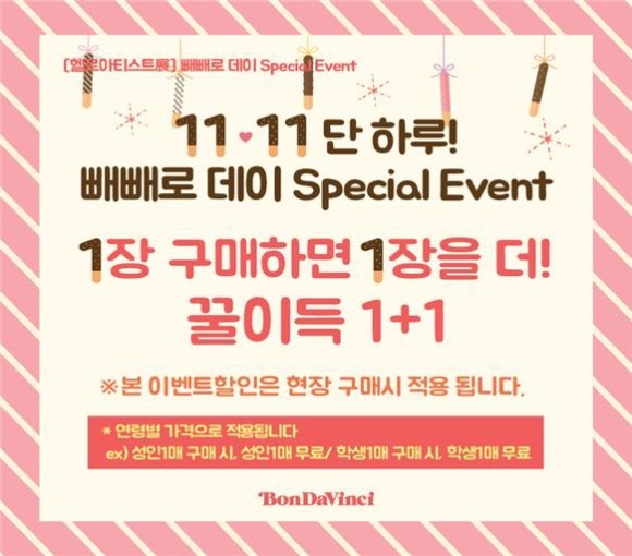 캐주얼 카페 컨버전스아트 전시 '헬로아티스트展'이 11월 11일 빼빼로데이를 맞이해 원플러스원(1+1) 티켓 이벤트를 펼친다.전시기획사 본다빈치에 따르면 빼빼로데이에 전시장을 찾은 관람객을 대상으로 1명이 티켓을 구매하면 초대권 1장을 즉석에서 제공한다.지난 7월 서울 반포한강공원 솔빛섬에서 개막한 '헬로아티스트展'은 한강 위의 야경을 볼 수 있는 카페형 전시로, 인상주의 화가 8인의 작품을 '마인드풀니스'로 즐길 수 있다.무엇보다 따뜻한 차를 마시면서 관람할 수 있어 추운 겨울 연인과 데이트 하기에 안성맞춤이다. 또, 커다란 스크린에 화가들의 명작을 재창조해 내는 본다빈치의 전매 특허 컨버전스아트 전시로서 많은 미디어아트 팬들의 지지를 받고 있다.본다빈치는 "11월 11일 빼빼로데이를 맞이하여 올 한해 고마웠던 지인이나 친구, 연인, 가족의 손을 잡고 와서 예술로써 마음챙김을 할 수 있길 바란다"며 "모든 관람객들이 낭만적인 한강 야경을 배경으로 소중한 추억을 담아가셨으면 좋겠다"고 전했다.전시는 연중무휴로 오전 10시 30분부터 오후 10시까지(월요일은 오후 6시~오후 10시) 펼쳐지며 자세한 정보는 홈페이지를 통해 확인할 수 있으며, 예매는 하나티켓에서 가능하다.[사진=본다빈치]
